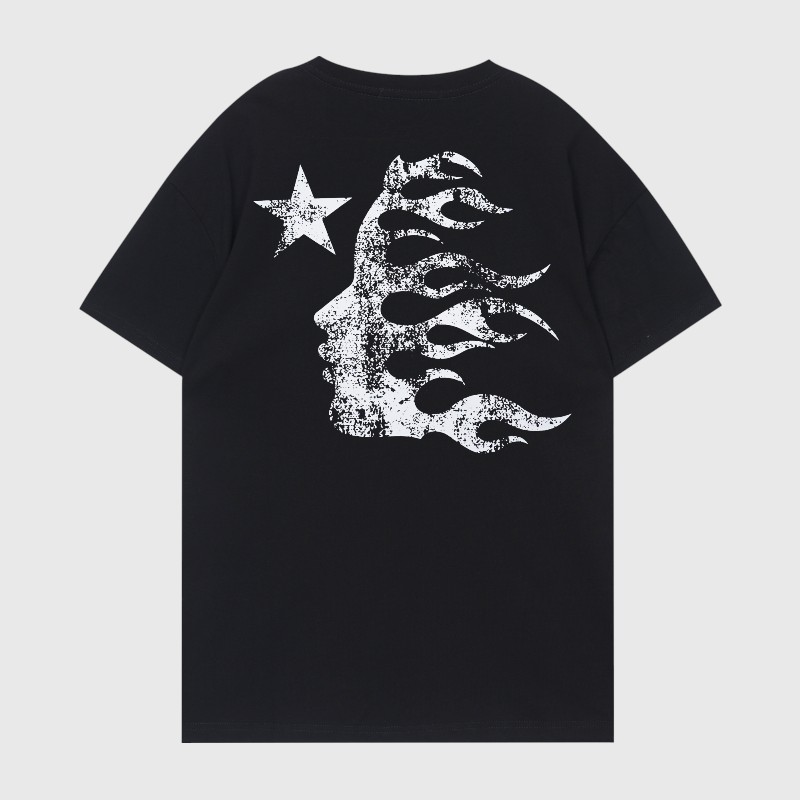 • Classic Black Base Color: The deep black color of the t-shirt provides a perfect, dramatic backdrop that makes the fiery red heart and white lettering truly pop, ensuring the design stands out clearly. This versatile black Hellstar t-shirt easily integrates into any wardrobe.