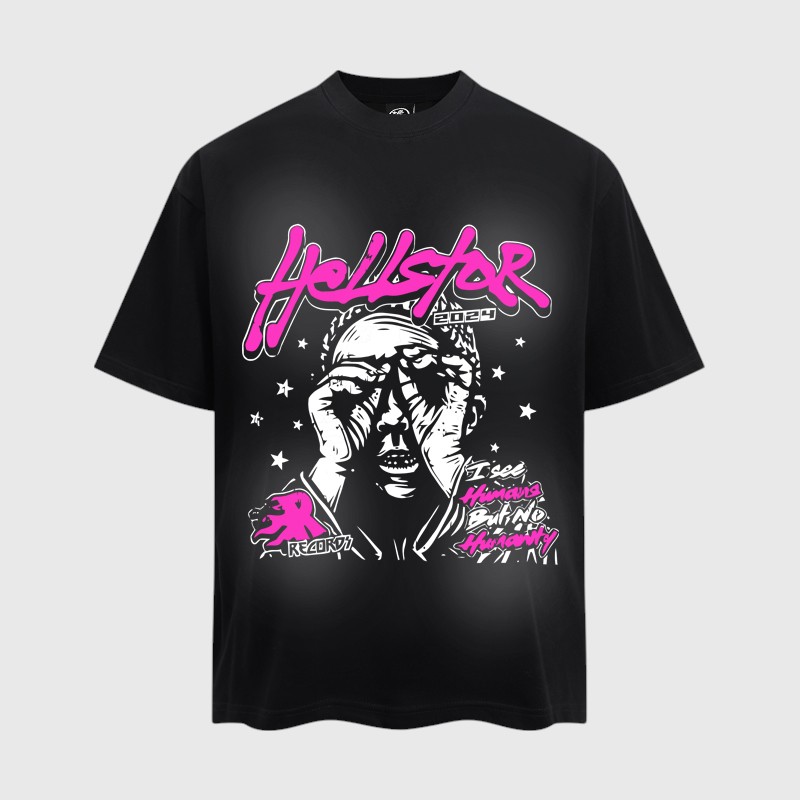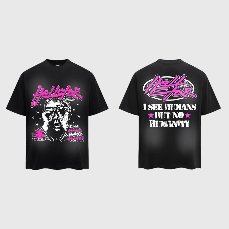 • Impactful “I See Humans But No Humanity” Slogan: The profound message “I See Humans But No Humanity” is elegantly integrated into the graphic in a matching hot pink, adding deep meaning and a conversational element to the design. This powerful phrase elevates the Hellstar t-shirt beyond mere fashion.