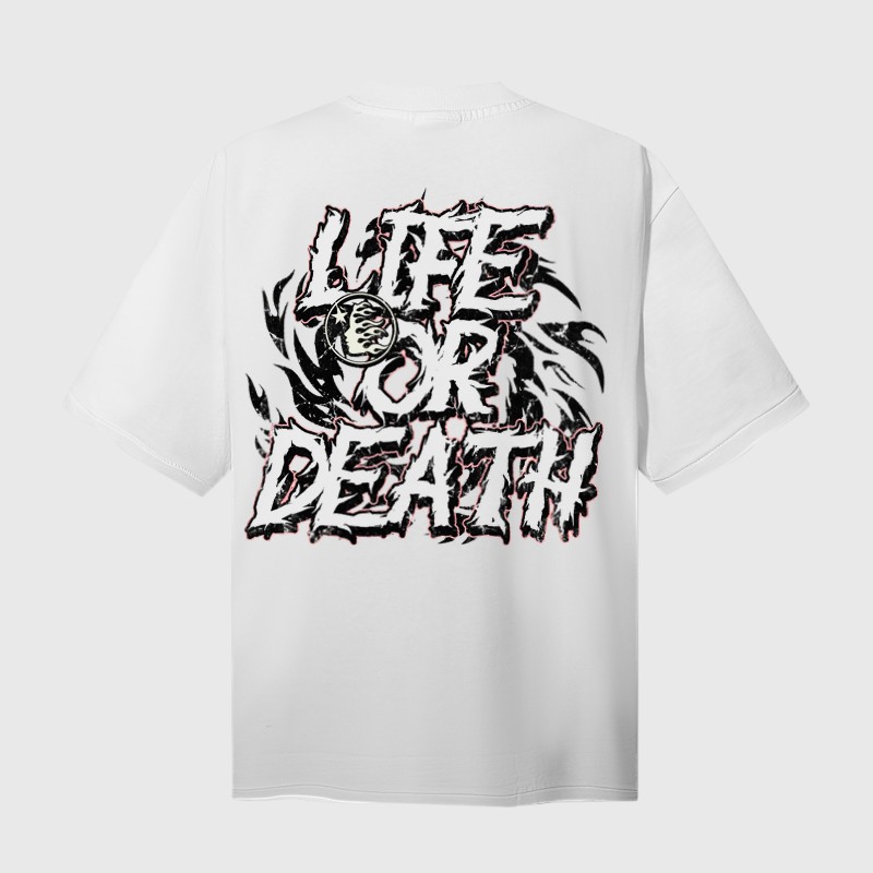 - Vibrant & Distressed Color Palette: The graphic boasts a bold color scheme dominated by fiery reds, deep blacks, and gritty grays, creating a powerful contrast against the white base of the shirt. Subtle splatters and distressed effects add to the raw, authentic feel of the design.