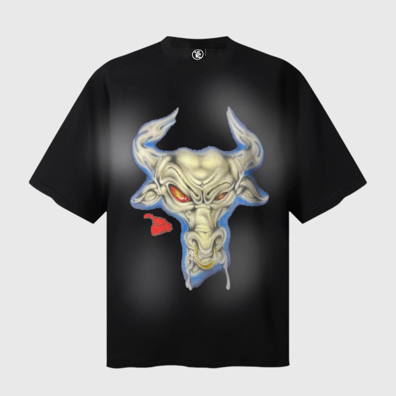 - Intense Red Eye & Drop Details: The bull’s eyes burn with an intense red, drawing immediate attention. A distinctive red drop graphic, possibly signifying blood or a fierce tear, is positioned below the bull’s snout, adding a raw, impactful detail to the Hellstar apparel.